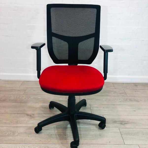 Senator Mesh Office Chair From quality British manufacturer Senator Fully Adjustable Operator / Task Chair Red FabricSeat Black mesh back Adjustable armrests Adjustable back height Forward tilt Adjustable seat height Swivel base on castor wheels Suitable for home or off...